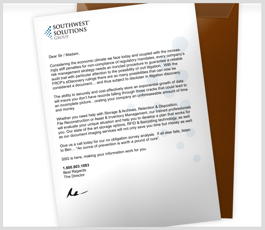Whether you need help with Storage & Archives, Records Retention & Disposition, File Reconstruction or Asset & Inventory Management, our trained information management professionals will evaluate your unique situation and help you to develop a plan that works for you. view letter